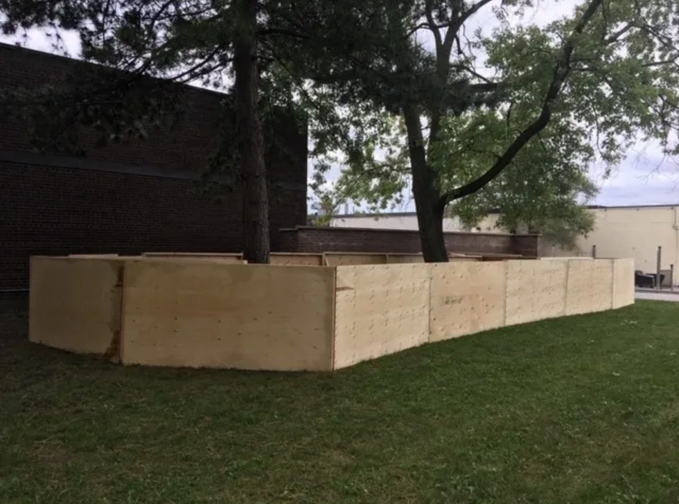 We love our trees in Toronto, and whenever we think something might hurt one of them, like a big truck that has to come to help somebody build something, we build little houses to protect them until the danger has passed. We build them out of wood, which is a little like building dog houses out of dogs, but we don't think about that too much.