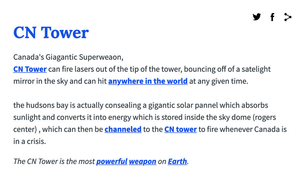 Who would have thought that the CN tower could double up as a massive weapon for Canada to use during a time of crisis? If this conspiracy theory rings true, then Toronto is in safe hands if the city's ever in some serious trouble.