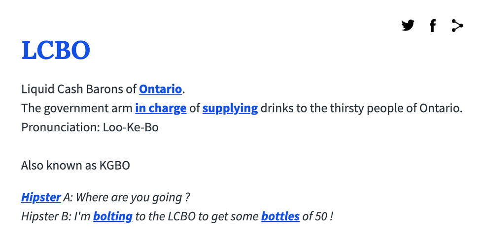 Someone took some civil liberties with what the LCBO actually means (which is the Liquor Control Board of Ontario). Who here calls the LCBO as the "loo-ke-bo"?