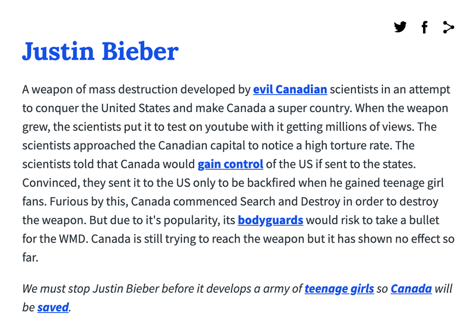 Apparently the CN tower isn't the only Ontarian that doubles up as a weapon. The beloved Canadian superstar, Justin Bieber, is also apparently a "weapon of mass destruction" created in an attempt to overthrow the U.S.