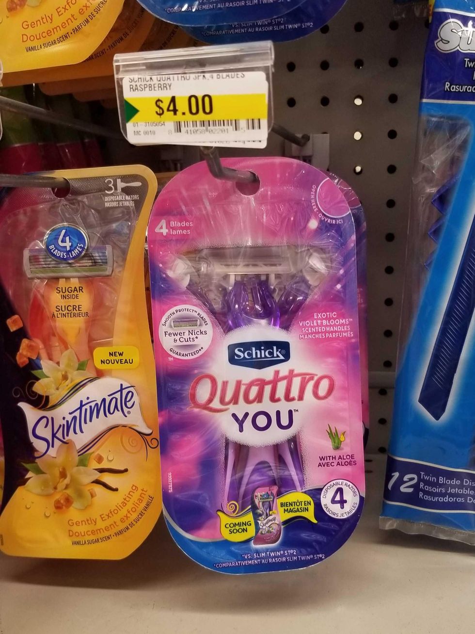 Details: You pick up four razors for $4 at Dollarama, which is $3.97 cheaper than Walmart. A dollar per razor is an excellent bargain.
