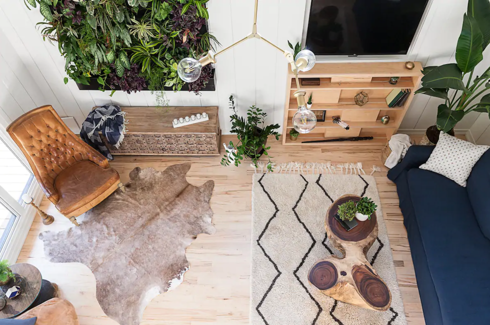 The barn features one bedroom, one bathroom, and a ton of plants, including a small living wall by the TV.