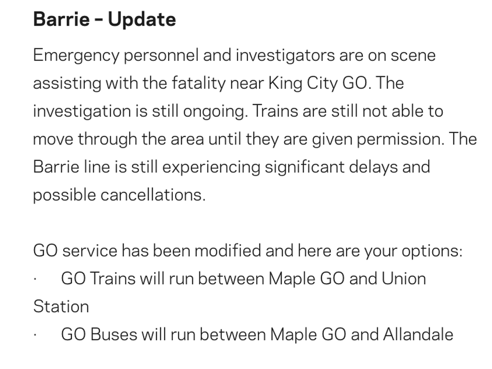 The Go Transit Twitter account Barrie Train first tweeted about the incident at 11:15 a.m. and has been providing updates about the investigation.
