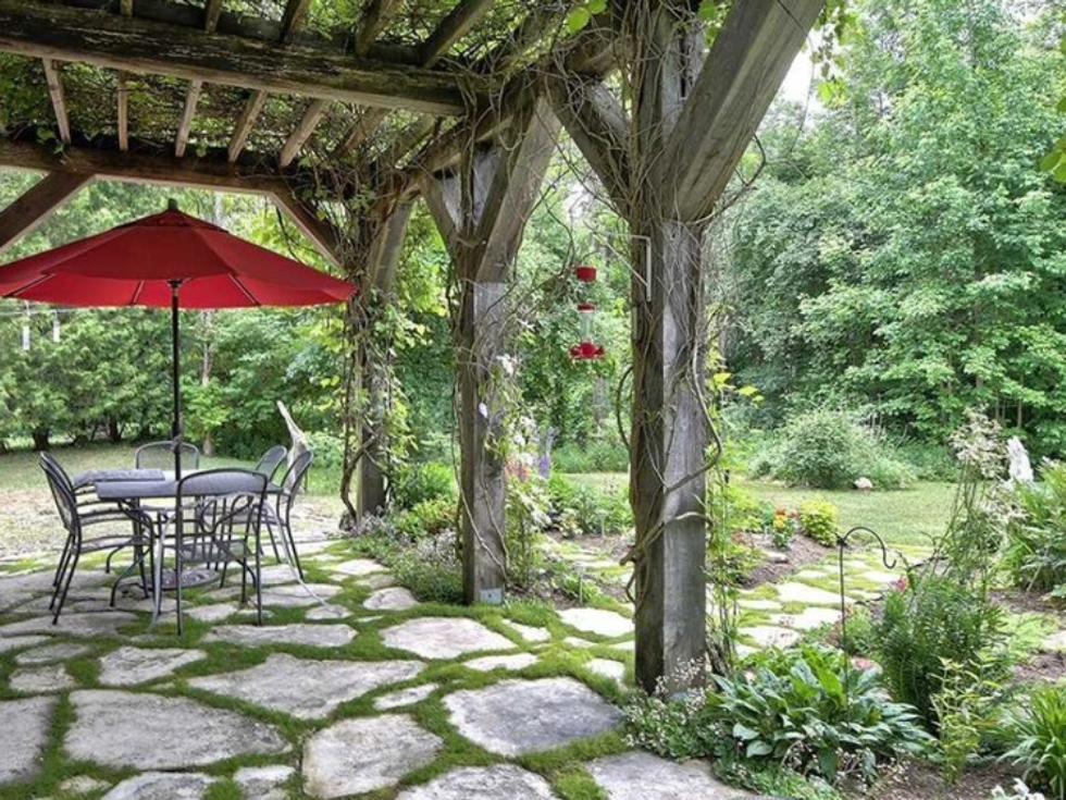 A side door in the home opens to reveal a whimsical garden complete with stone pathways and a vine-covered patio where you could sip that morning coffee in true serenity.