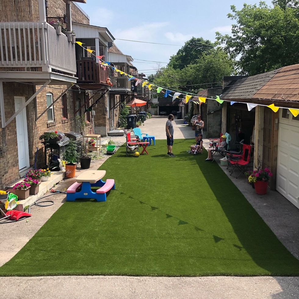 The area was originally a four-spot parking lot for the neighbourhood vehicles, making it the perfect size for a shared community lawn.