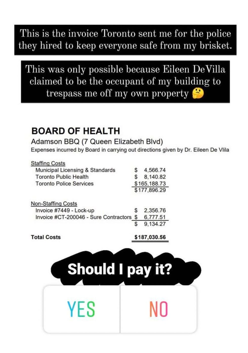 The City of Toronto is billing the owner of Adamson Barbecue for the amount of money it cost them to close his restaurant and keep it closed.