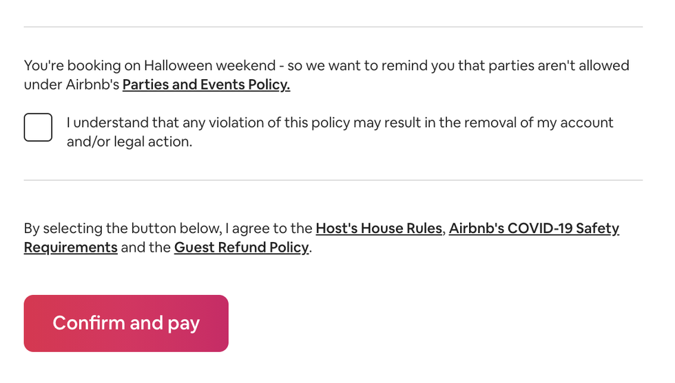 Guests making one or two-night resos will have to confirm they fully understand the party ban and that they could face suspension or legal action if they violate it. Airbnb has also warned that they plan to enforce further restrictions for two-night reservations that "may pose heightened risk for parties."