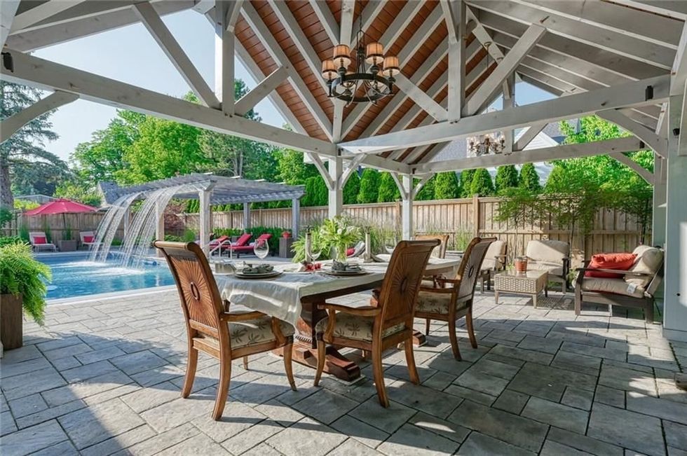 The back patio features so many bells and whistles like a large shaded seating area, a heated inground pool, and even a remote-controlled waterfall. Yes, you read that right.