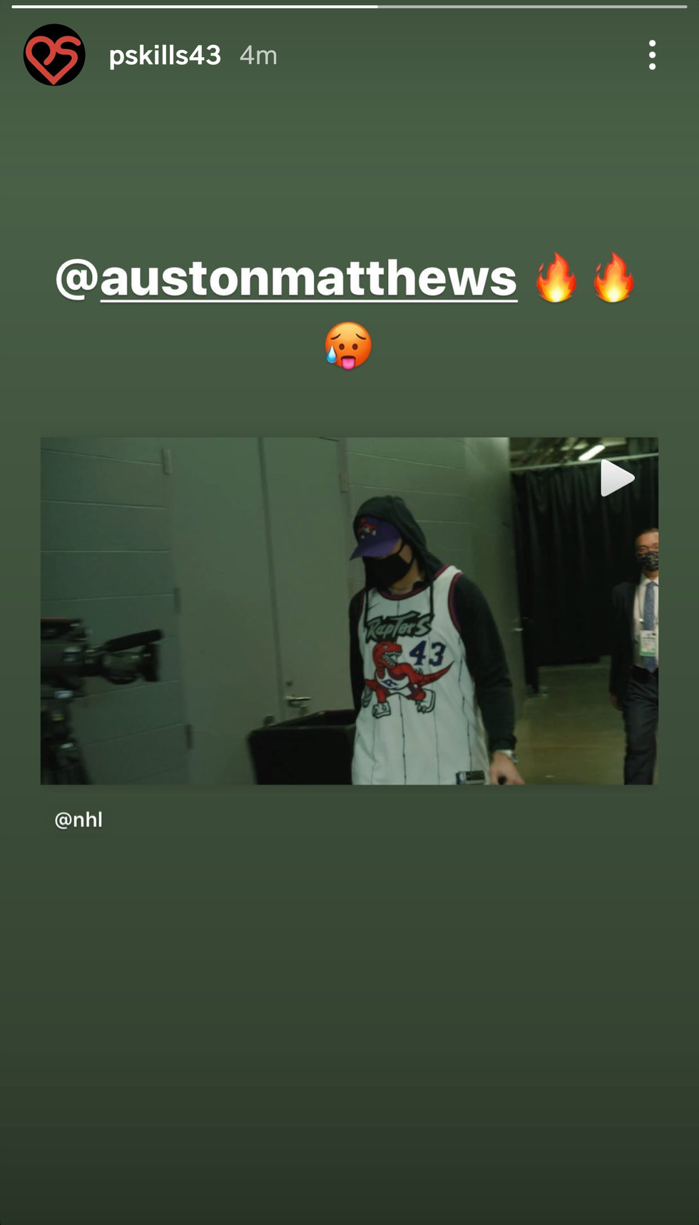 The Leafs shared a snap on Thursday afternoon of AM34 wearing an old-school Raps jersey and hat (as well as a face mask, of course) before the team's latest clash.