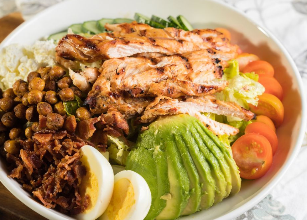 Why You Need To Try It: This American-style salad is both refreshing and tasty. Packed with chopped romaine hearts, grilled chicken, bacon, avocado, goat cheese, crispy chickpeas, cherry tomatoes, cucumbers, hard-boiled egg, and a honey-dijon dressing, it might even leave you feeling full all the way to bedtime.