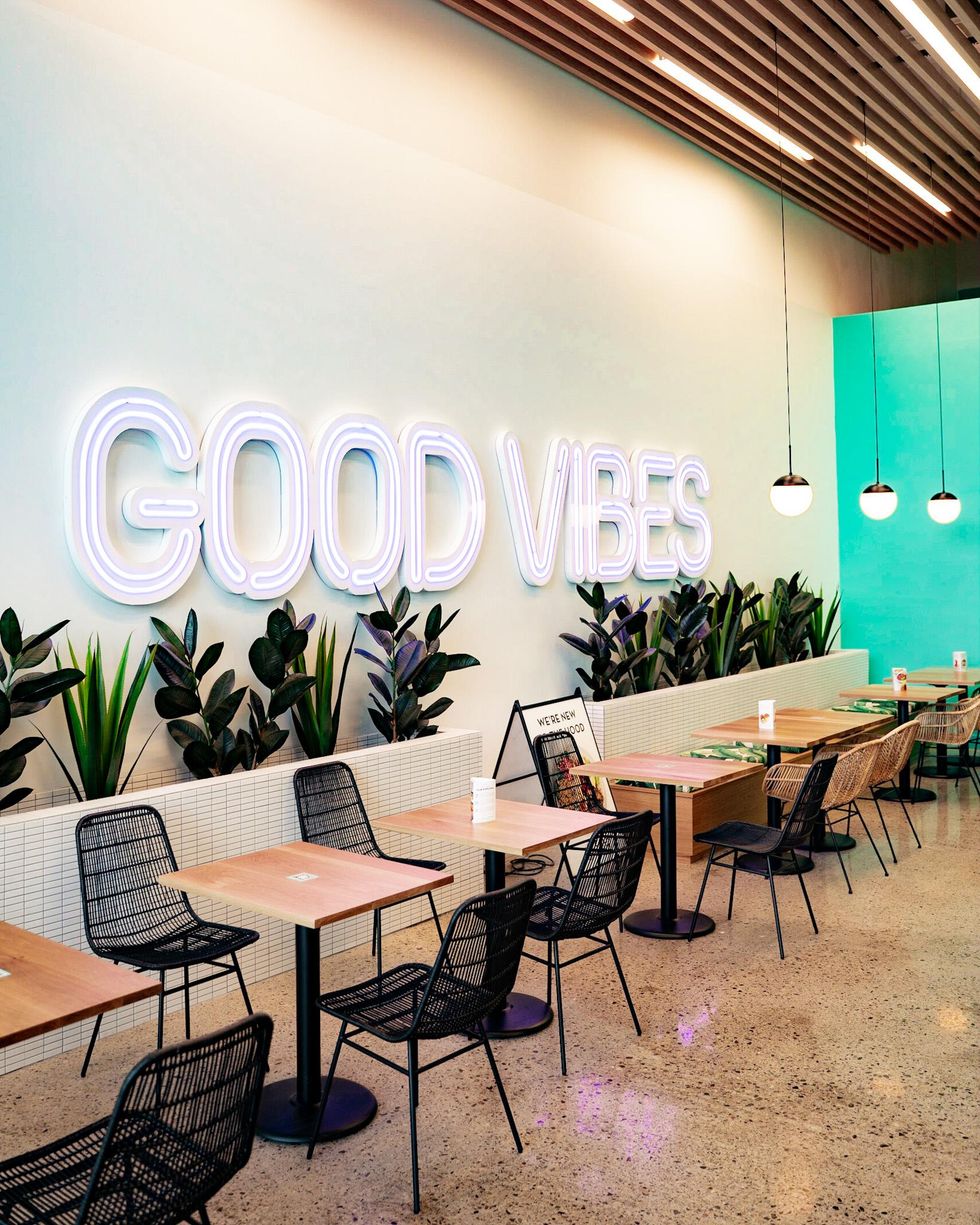 The interior has bright, Instagrammable decor with a vibrant neon sign and tropical vibes.
