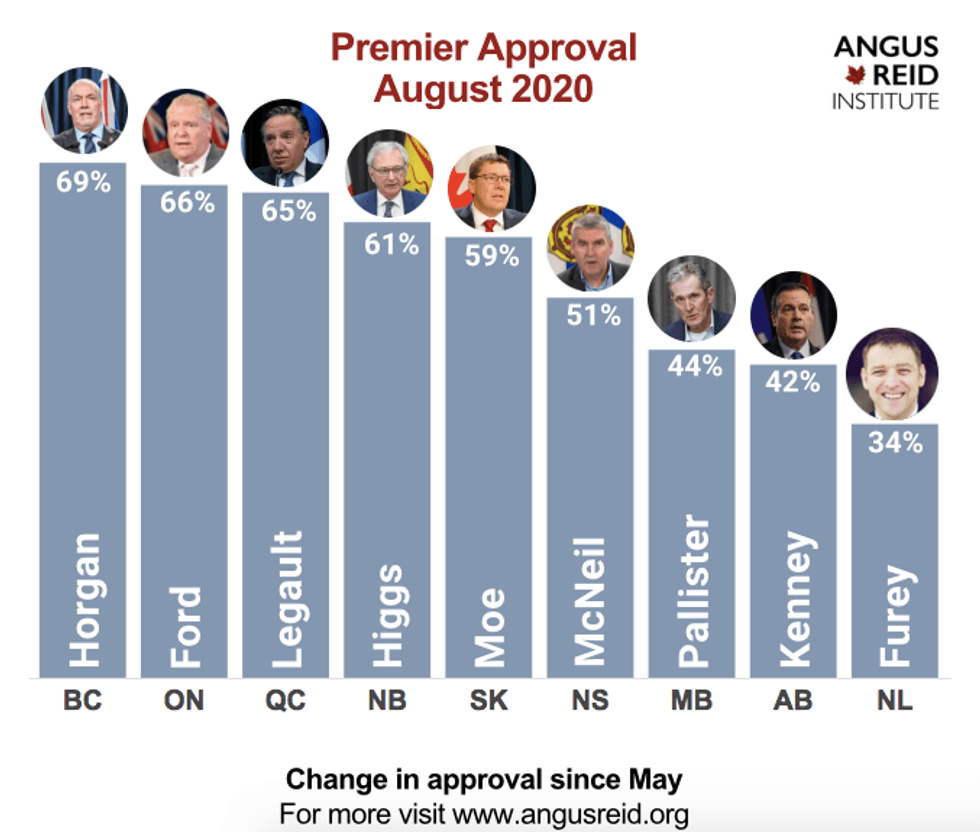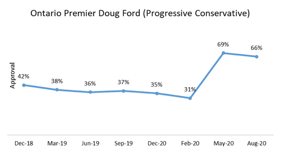 Apparently, the pandemic has done wonders for Premier Doug Ford's approval ratings. In The Angus Reid Institute's newest data, Ford holds second place as the country's most approved-of premier.