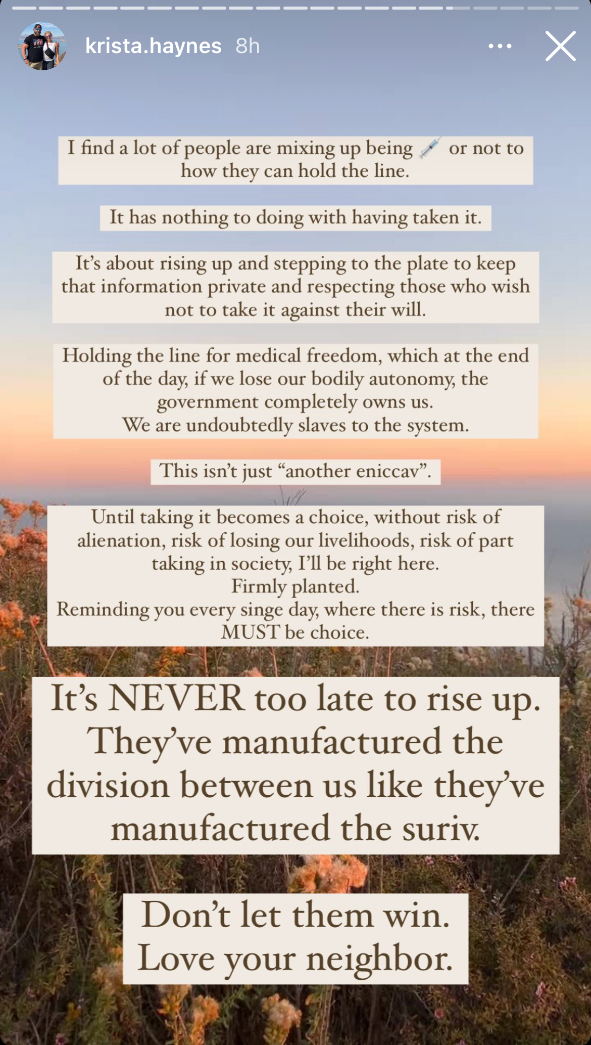 In an Instagram story posted early on Thursday, Haynes shared a cryptic anti-vax message against a serene sunset backdrop.