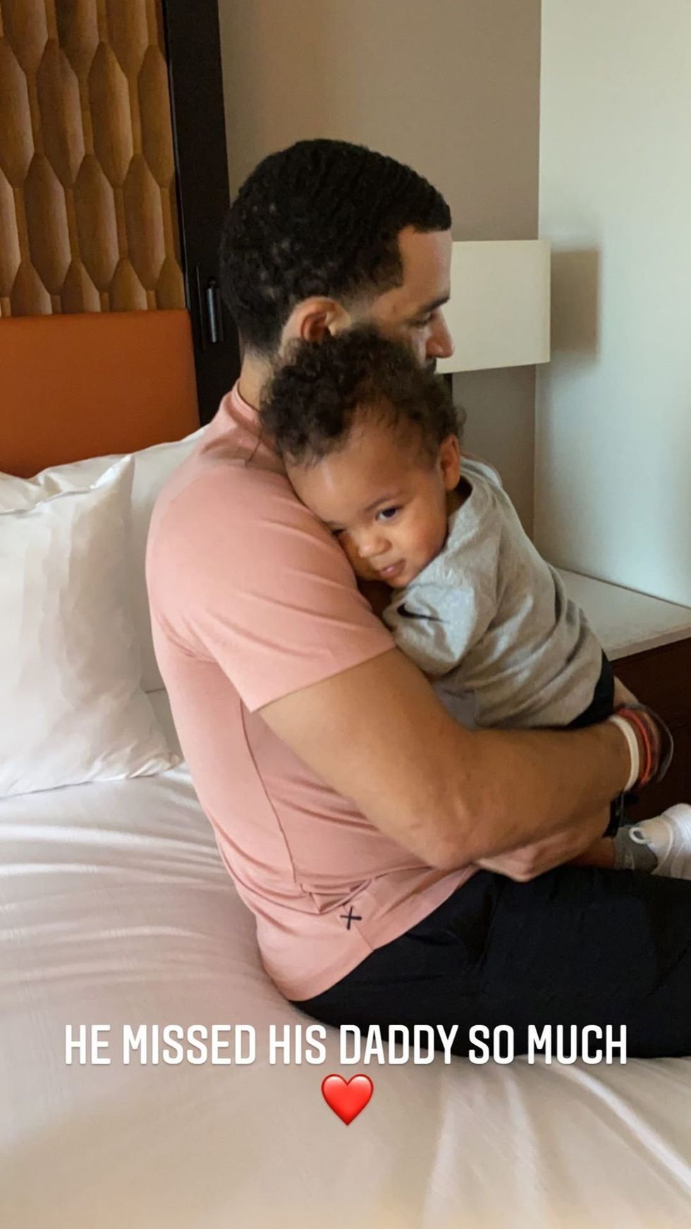 However, a photo showing the two cuddling in bed highlights how much the little guy missed his dad.