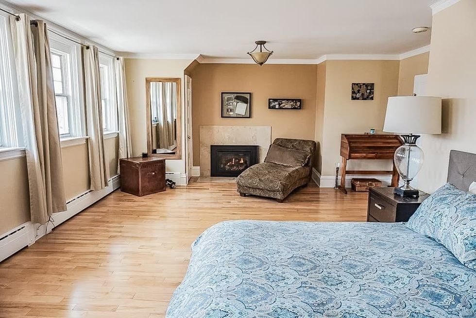 Beyond the entrance, you’ll find impressive nine-foot ceilings and a master bedroom that features a cozy fireplace.