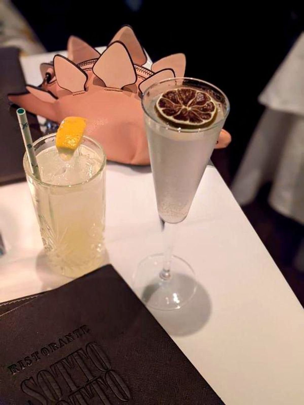 A lemon soda, a cocktail and my Stegosaurus purse named Genevive.