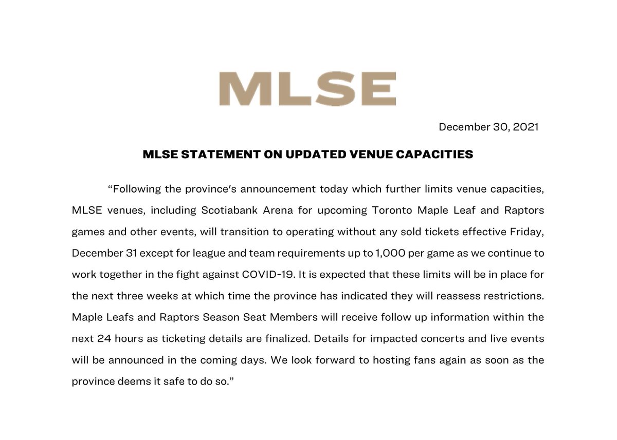 Maple Leafs Sports and Entertainment also announced that as of Friday, Dec. 31, 2021, Scotiabank Arena would be transitioning to "operating without any sold tickets."