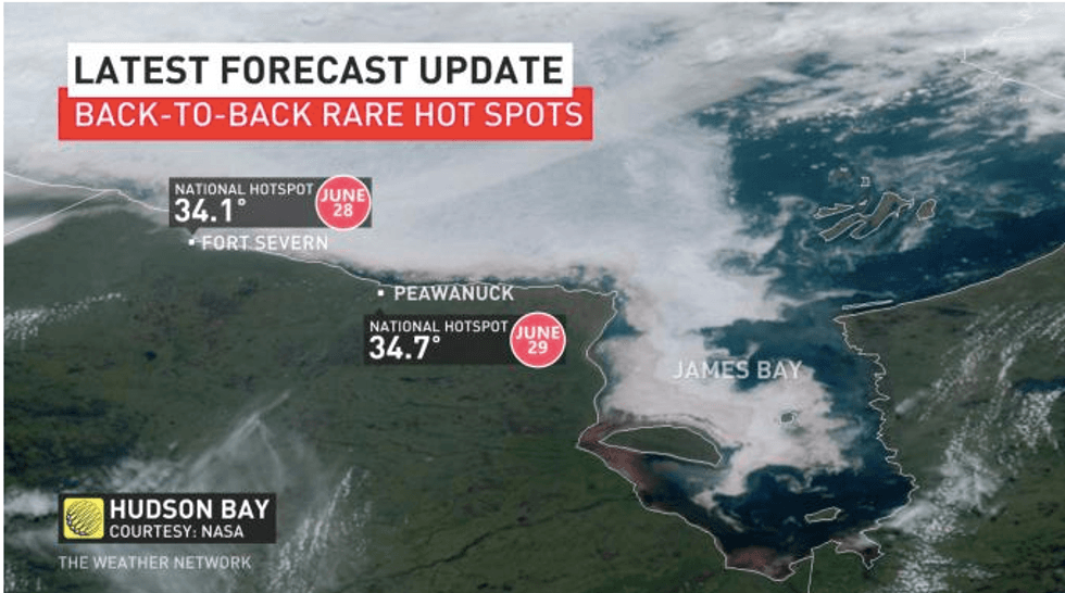 Due to this weather pattern, Moosonee, an Ontario town so north that it has no road access, is set to be the hottest place in all of Canada today.