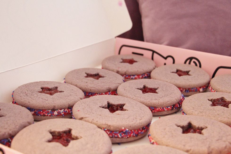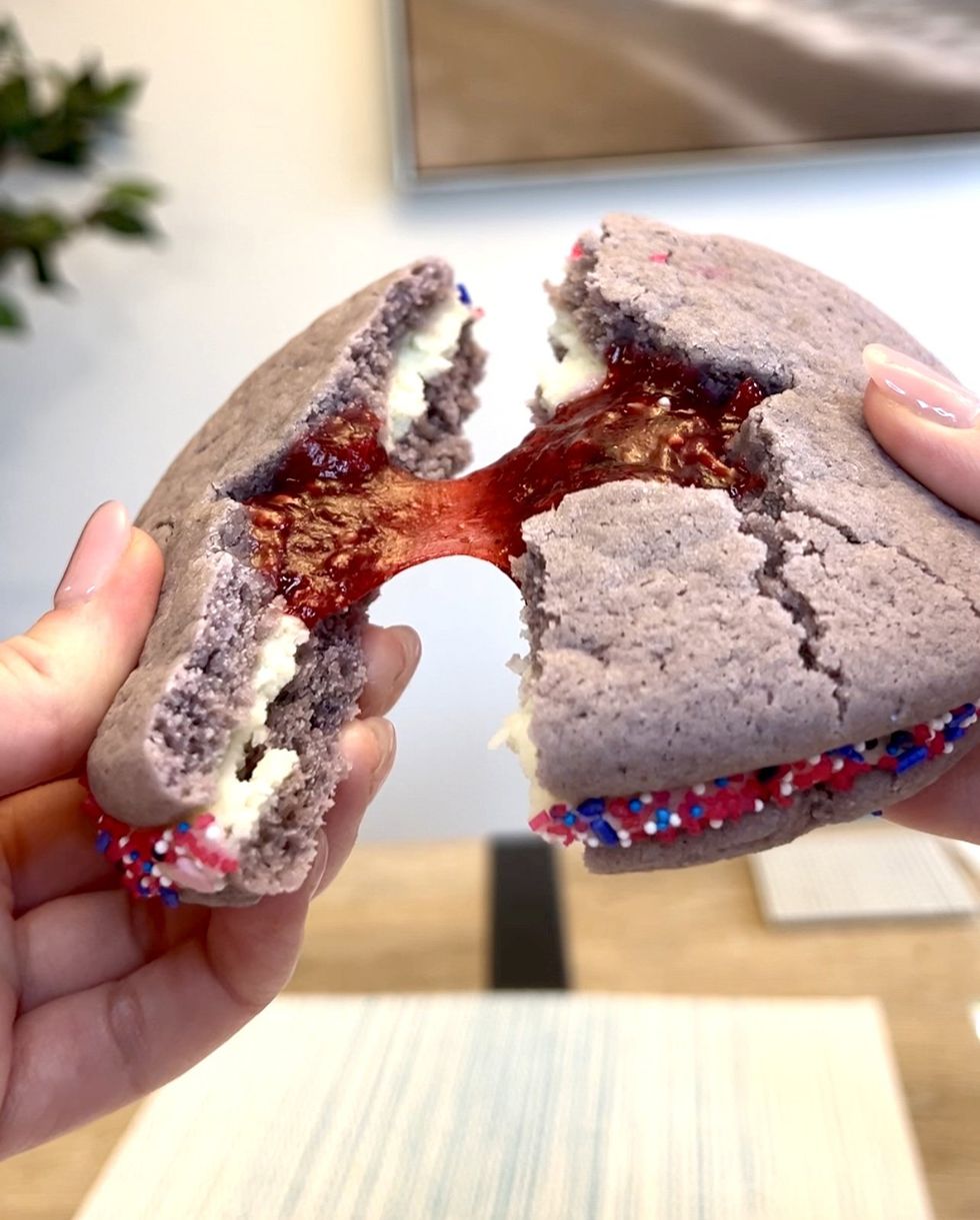 As described in a press release, the GUTS Cookie consists of "two chilled purple vanilla cookies sandwiched around delicious layers of triple-berry jam and light vanilla buttercream, rolled in colorful star-studded sprinkles, and topped with a star cutout."