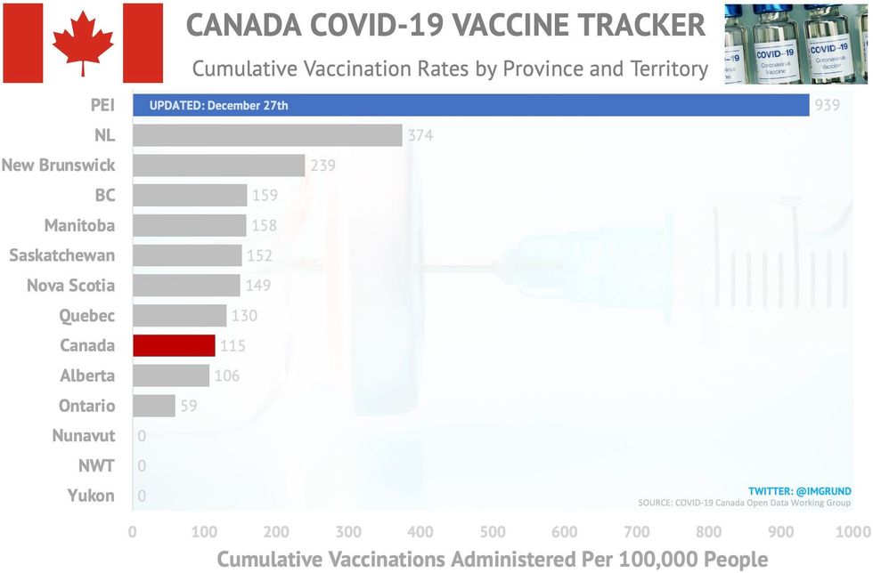 A chart by biostatistician Ryan Imgrund posted on Twitter today shows that Ontario is in last place for vaccinations per 100,000 people among the provinces who have delivered the Pfizer vaccine.