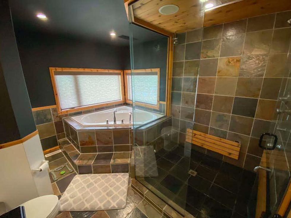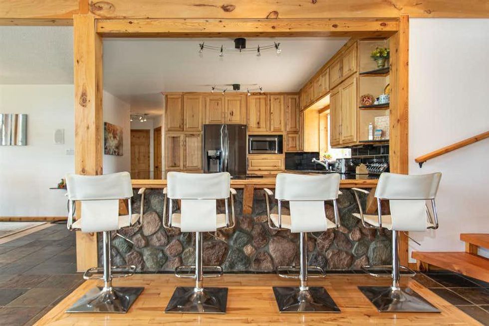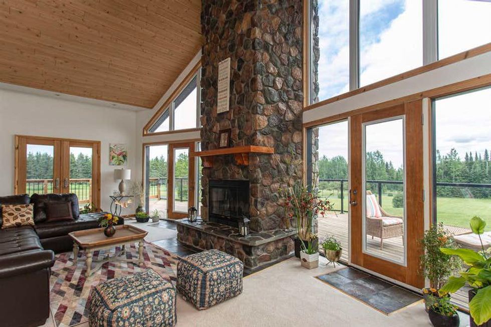 Its rustic interior is custom-built with 19-foot ceilings and a massive stone fireplace, making it the perfect place to cozy up in the winter.