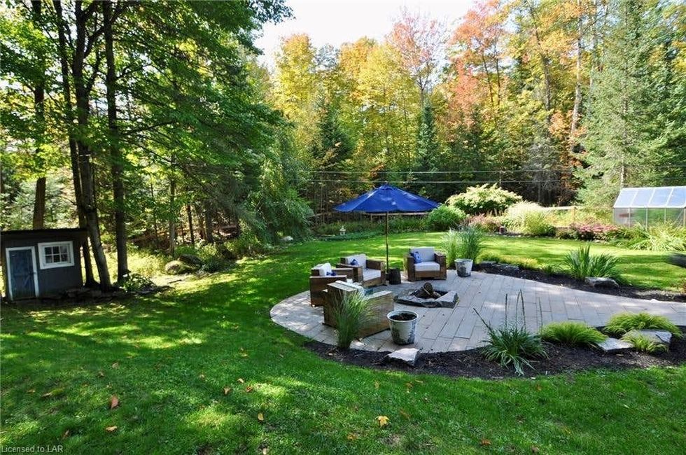 The yard is a true gem featuring lush gardens, a greenhouse, and an amazing patio with a built-in fire pit.
