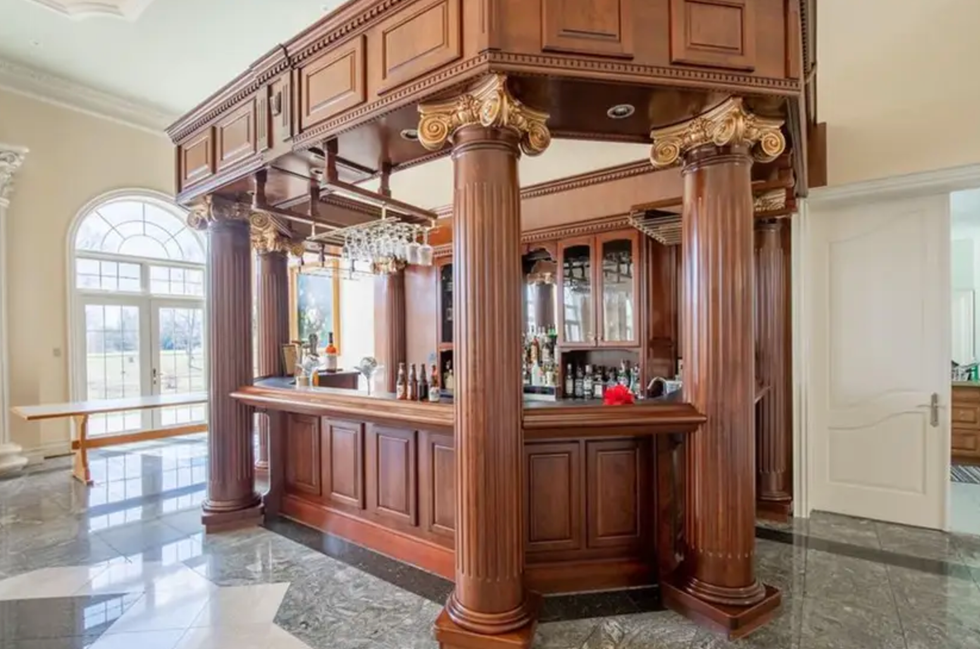 This rich oak-coloured bar is fit to make the fanciest at-home cocktails.