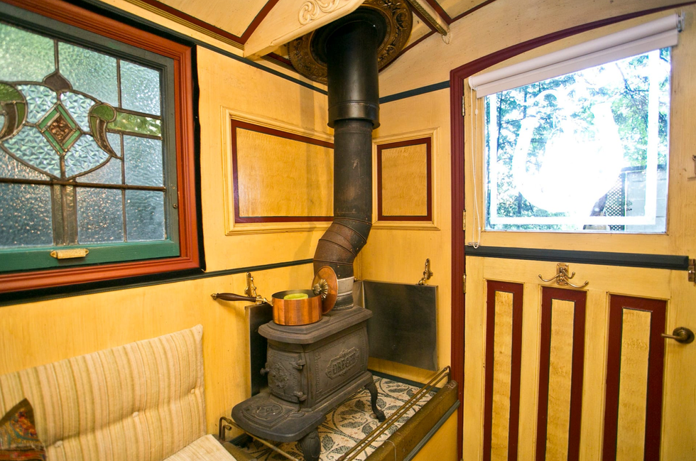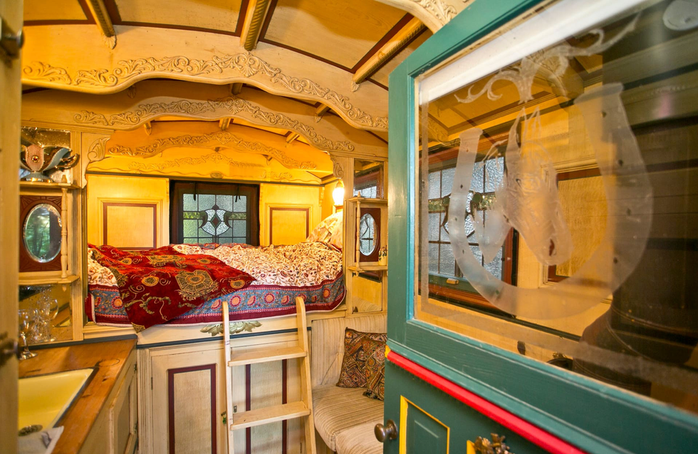 The authentic horse-drawn caravan has been transformed into a tiny Airbnb, complete with a cozy bed and wood stove.