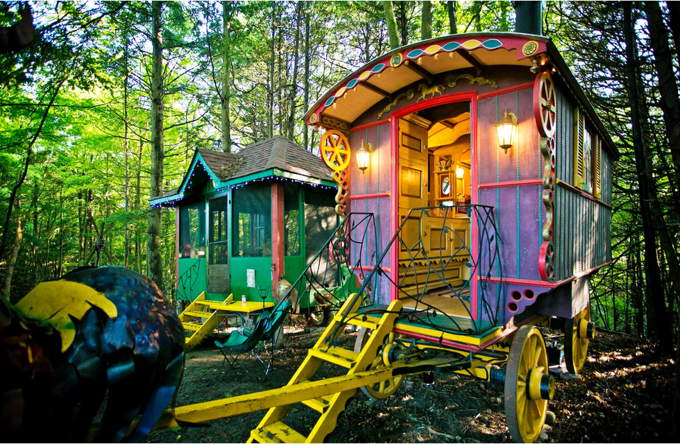 Why You Need To Go: These Romani Caravans are nothing but magic. Located in an enchanting forest, these rainbow wagons are right next to a blooming orchard and serene pond.