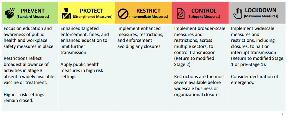 Next is red. Red indicates the "control" zone. Again, no public health units are currently in this zone. Regions in this zone would face stringent measures and closures across sectors.
