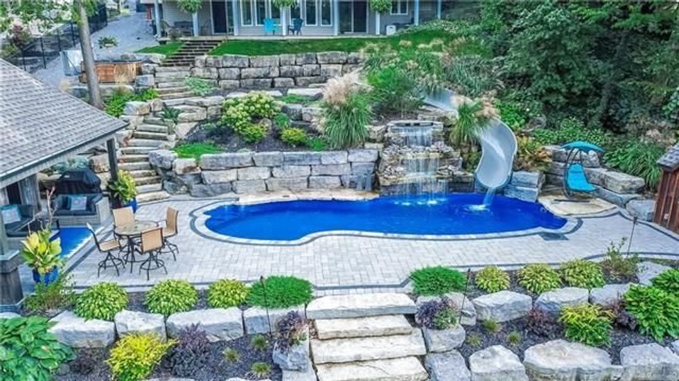 Palm trees, sandy shores, and twisting water slides might sound like something you'd find on a tropical getaway, but this Ontario home for sale comes with its own summer paradise. With a mini-resort in the backyard, there's no need to book a trip down South when living at this spot. This Ontario beach house for sale lets you live like you're on vacation.