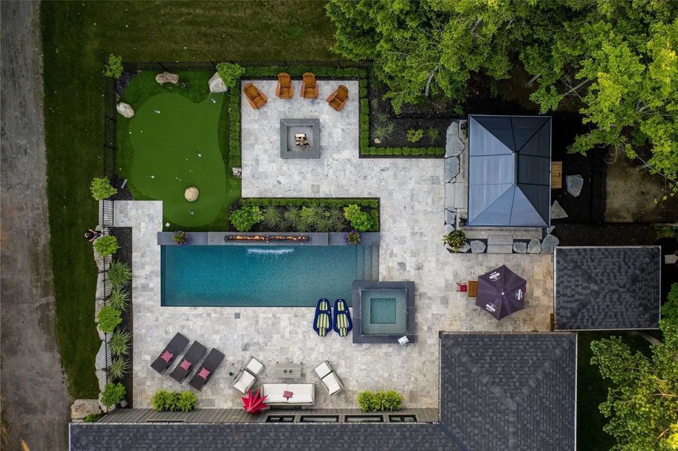 You'll never have to go on vacation again after moving into this spot. This impressive mansion for sale is basically a private resort, and it comes with the hottest swimming pool around. You can play golf in your yard, sip wine at your own hidden bar, and swim alongside fire at this over-the-top home. Ontario's waterfall pool home is nothing short of a-blazing.