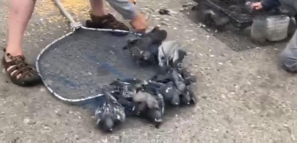 She recorded a video of the pair and asked them what they were doing with the birds. "I take them to my farm, and then I raise them," the man can be heard saying as he continues to put them into cages. Doberstein said that she recalls seeing him doing the same thing last year.
