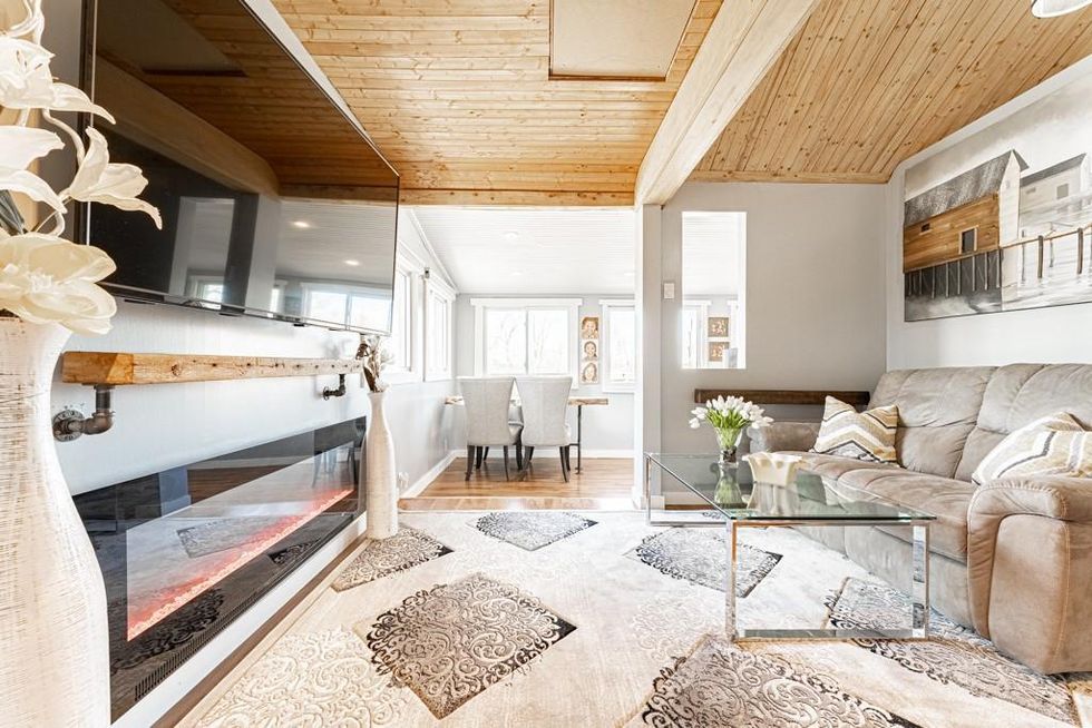 Inside, you'll find a modern design with wooden floors and ceilings and windows with nature views. The in-wall fireplace gives the space a swanky feel, and the open-concept living room and kitchen are bathed in natural light.