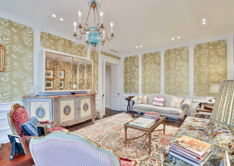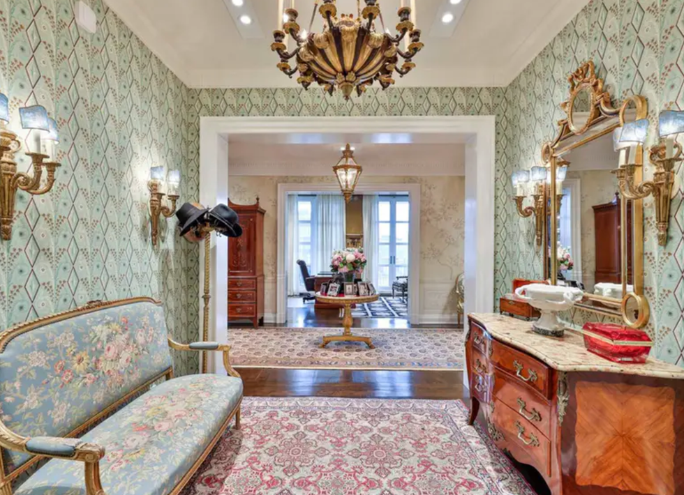 This stunning home has truly unique wallpaper that one could expect to see in a stateside manor in the English countryside. Also, just look at that hardwood flooring (they're made of walnut, which just screams luxury.)