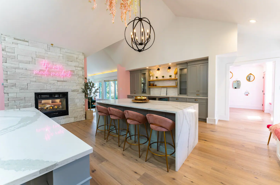 Some other highlights of the Airbnb include an oversized chef's kitchen with a glowing rosé sign and 14-foot tall vaulted ceilings, as well as a 70-inch smart TV and a double-sided gas fireplace.
