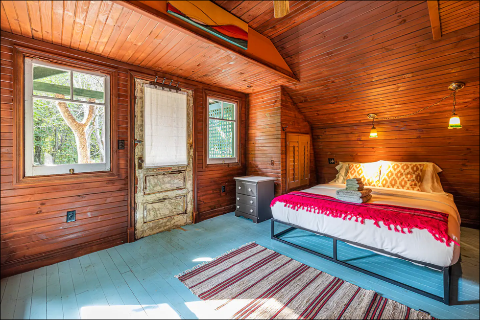 The rooftop patio lets you gaze over the trees while you relax with a drink, and it even comes with lake views. There's a bungalow on the property which features another bedroom and dreamy decor.
