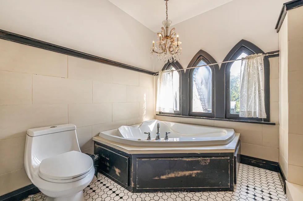 The ensuite batjroom has a stunning Jacuzzi tub complete with a chandelier so you can bathe like royalty. The distressed wood, black and white tiles, and arching windows add to the historic French vibes.