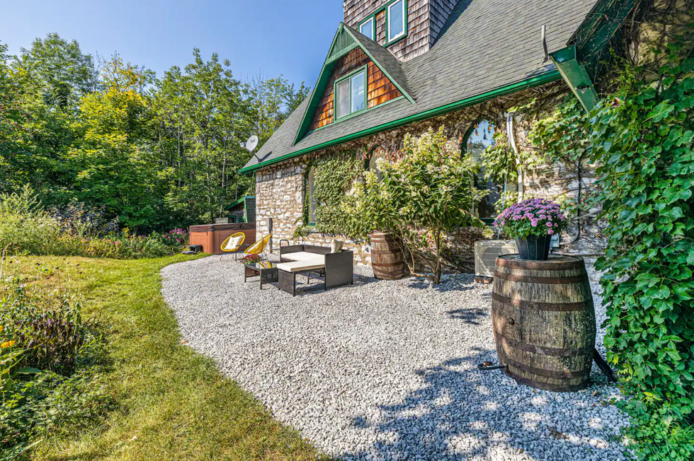 The patio is complete with vine-covered walls, furniture, and a hot tub. Hidden away amongst trees, the Airbnb offers privacy, serenity, and a little taste of yesteryear.