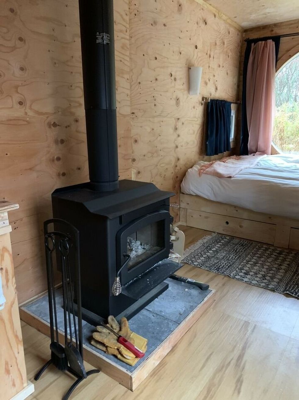 Description: This custom micro-cabin comes with a beautiful large window just above the bed and a firewood stove.