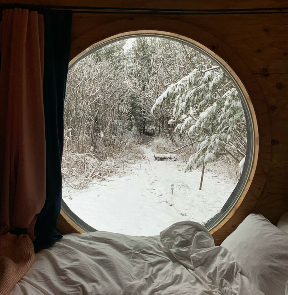 This custom-designed tiny cabin has a 60-inch round window right beside the bed, so you can stay cozy under a blanket while you observe the outdoors.