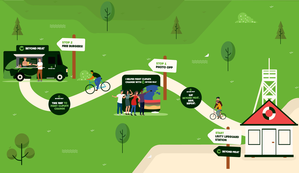 The multi-stop adventure begins at the Leuty Lifegaurd Station includes a photo op as well as decals along the bike path that lead to the burgers. The burgers come with a plant-based Beyond Meat patty and are served in biodegradable boxes. The signage is also biodegradable.