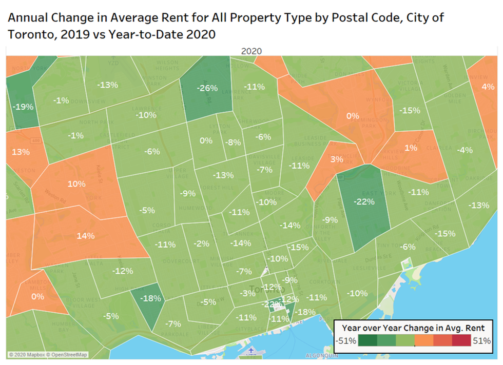 And rentals right downtown — between Queen Street and King Street — also dropped from between 18% and 22%.