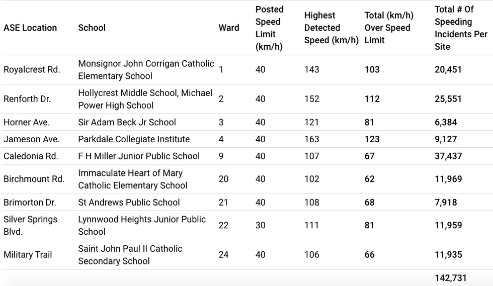 City data found there were nine problematic areas in Toronto that had amassed over 140,000 speeding cases since January 27.