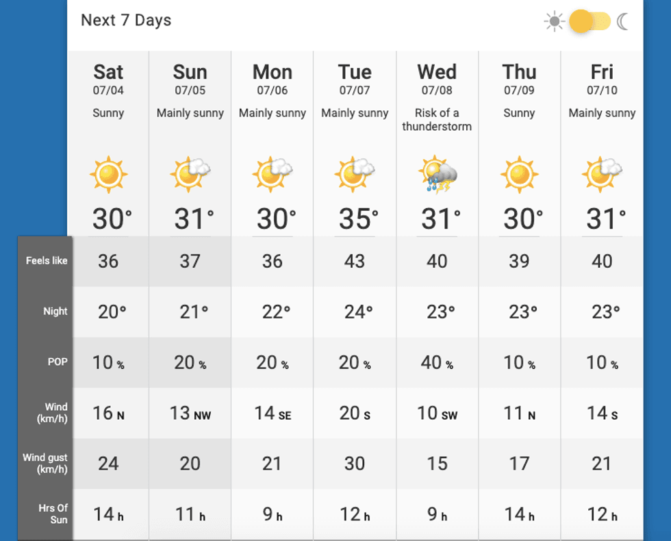 Temperatures will gradually increase up until Tuesday, July 7 where the hottest day will hit. That day, the scorching 35 C temperature will actually feel like an eye-watering 43 C.