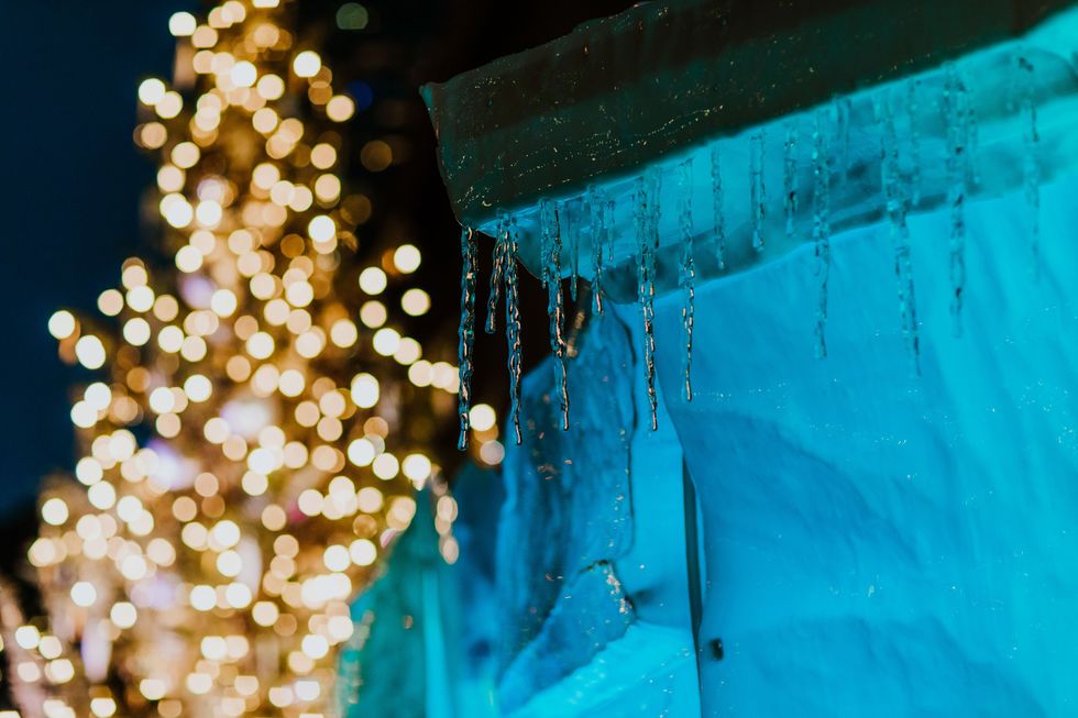 The luminous event features installations of massive icy cliffs and a dazzling frozen waterfall.