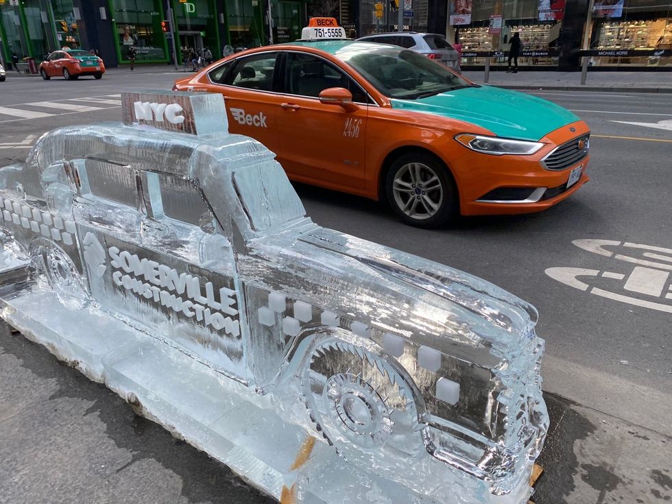 You can see famous landmarks made out of ice, such as the Statue of Liberty and the Eiffel Tower.