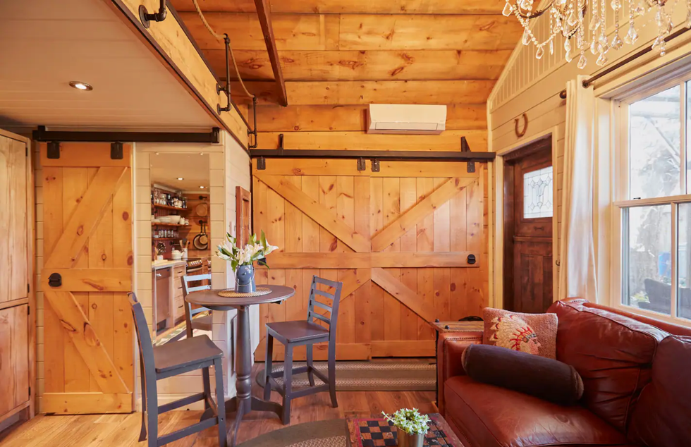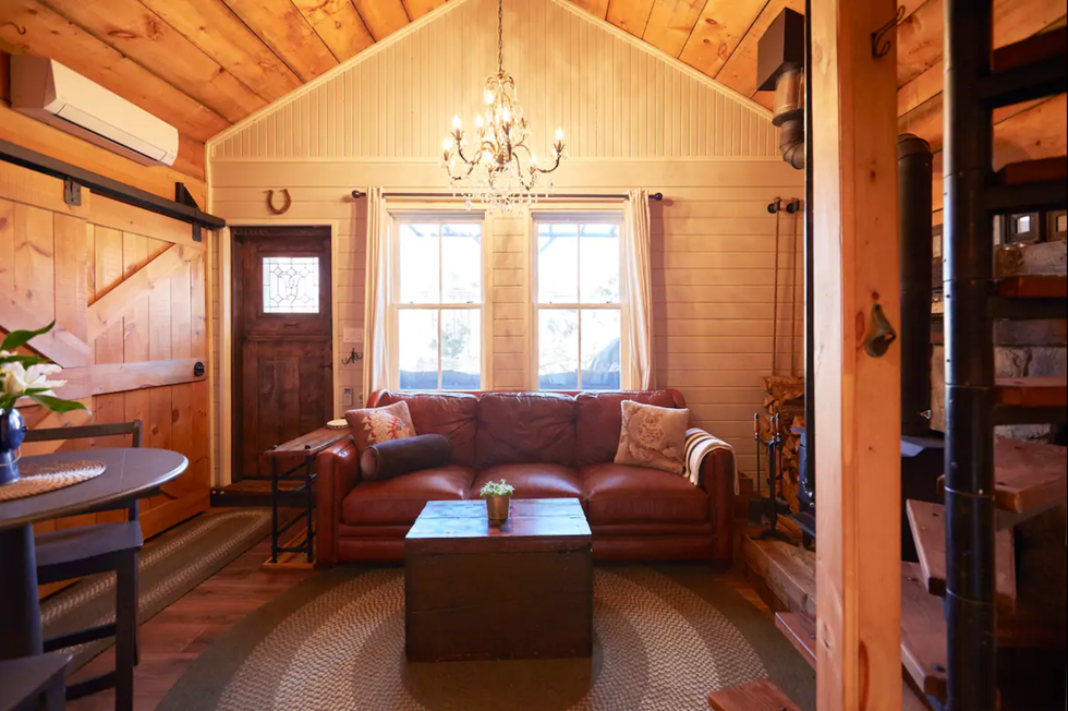 Inside you'll find a comfy leather couch, chandelier, and cozy loft with a bed.