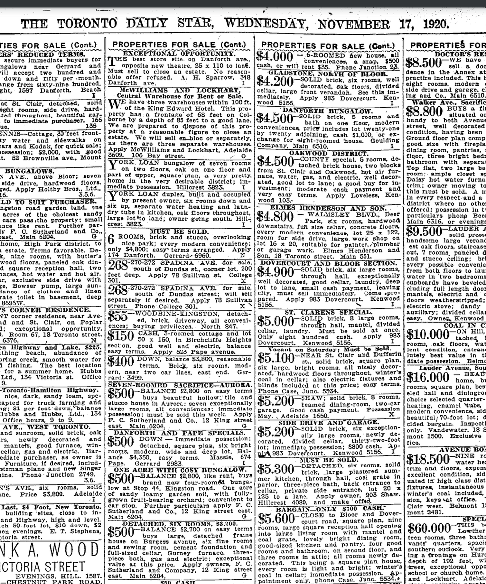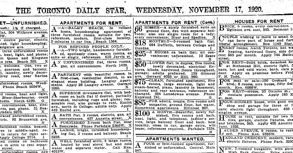 Whether you were renting an apartment or buying a house, housing was a whole lot cheaper in 1920s Toronto, according to the November 17, 1920 edition of the Toronto Daily Star (which later became the Toronto Star).