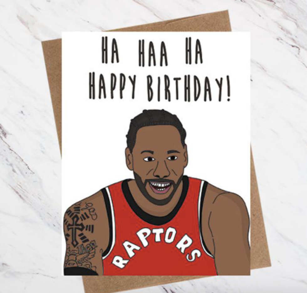 The first one is a birthday card, featuring the and only time Kawhi Leonard laughed.
